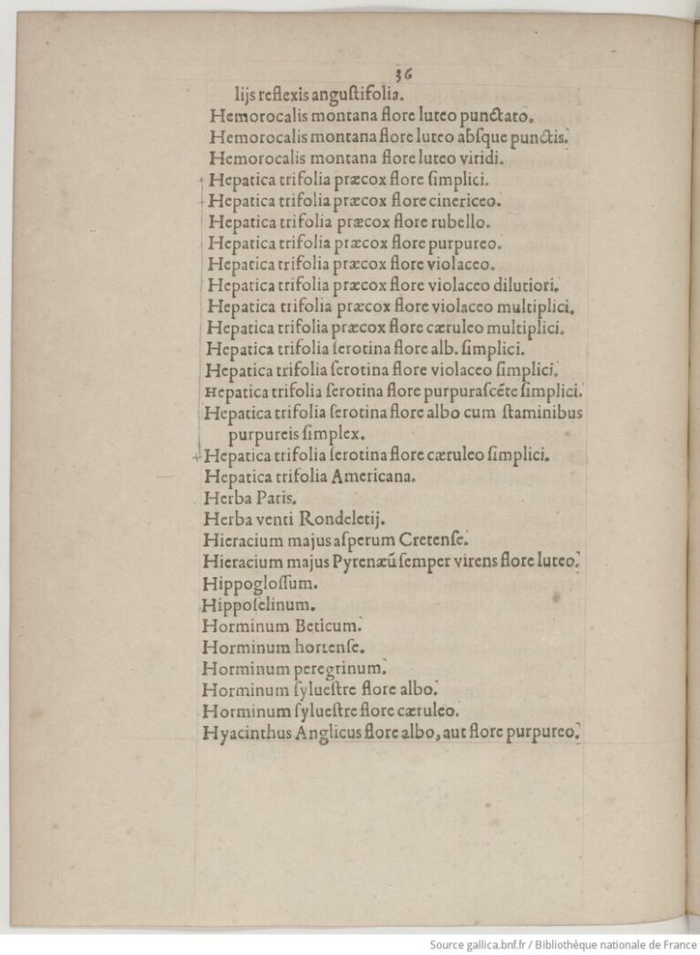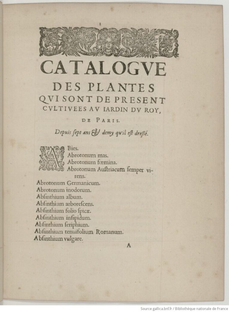 Guy de La Brosse, médecin ordinaire du roi et intendant du jardin, a rédigé un catalogue de l’ensemble des plantes cultivées au milieu du XVIIème siècle. Gallica publie l’intégralité de l’ouvrage. L’ouvrage débute par une dédicace à Claude Bouthillier, surintendant des Finances de 1632 à 1643, suivi par une note au lecteur et une liste d’étudiants de médecine pour l’année 1641 dévolus à la « connaissance des plantes au jardin royal de Paris ». Viennent enfin les pages du catalogue proprement dit.