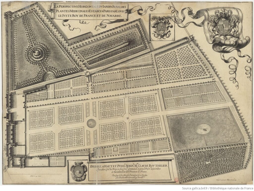 Les documents réunis — édit royal, arrêt d’enregistrement du Parlement de Paris, commission administrative et lettres de confirmation — permettent de suivre pas à pas la procédure juridique de fondation. Le roi confie la surintendance à son premier médecin Jean Héroard, qui délègue l’intendance effective au botaniste Guy de La Brosse, chargé de cultiver les plantes, d’en organiser les collections et d’en assurer les démonstrations publiques. Cette chaîne administrative illustre le fonctionnement concret de l’État monarchique : décider, enregistrer, nommer, financer. On trouvera également un plan du jardin dans les années 1640, des extraits du catalogue des plantes de Guy de la Brosse