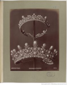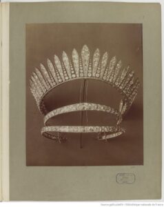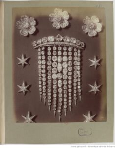 Diamants, perles et pierreries provenant de la collection dite des joyaux de la Couronne, photos non légendées de Michel Berthaud, 1887, extrait du catalogue de vente, source : Source : Bibliothèque nationale de France, département Estampes et photographie, 4-LE-62 (A)